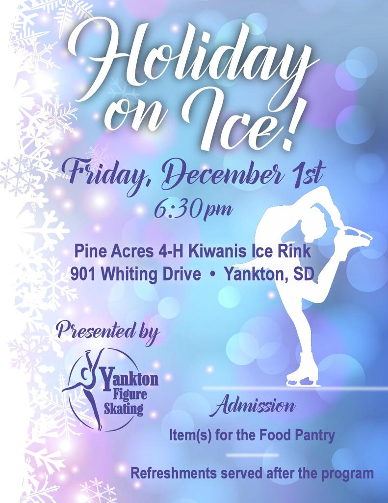 Yankton Figure Skating presents "Holiday on Ice". A skating performance to songs about the holidays. Admission is item(s) for the Local Food Pantry. Refreshments will be served after the performance.